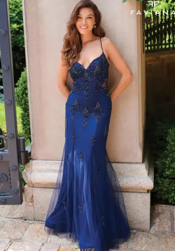 Draw the attention immediately wearing the remarkable long style 11227 by Faviana. The lovely top features a v neckline and displays a fascinating open back detailed with a tie lace corset to instantly snatch the waistline. Made in a trumpet silhouette and beautifully adorned with intricate clusters of applique and beadwork.