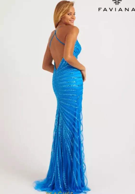 Shine brilliantly at prom in this radiant Faviana long dress style 11242 embellished with slimming lines of bead work. Offered in vibrant colors, this scintillating gown features a crossover V neckline on the fitted bodice with halter straps and low open crisscrossed strap back. The long straight skirt has a side slit and back sweep train.