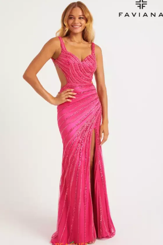 Make an entrance walking into your special event wearing Faviana long dress 11243. This gorgeous fitted dress reveals a lovely sweetheart neckline with thick beaded straps that showcases an eye catching entire open back. Rows of dazzling sequins and your thigh high slit will be sure to have all eyes on you.