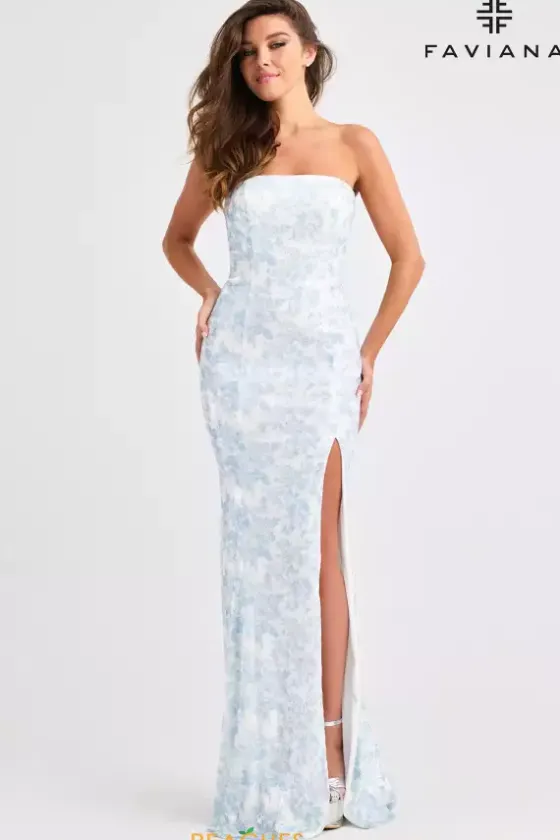 Feel sleek and elegant when you wear this fabulous long fitted dress made by Faviana style 11442. This graceful dress features a classic strapless straight across neckline that cascades down to a lovely corset lace up to show off your open back. Made in comfortable novelty material along with stunning touches of sequins. A high thigh slit is a must.
