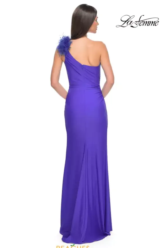 Less is more with this sleek and sexy La Femme prom dress 32076. This fitted jersey dress is perfect for hugging your curves and features ruching along the seams of the thigh high slit. The asymmetrical single shoulder neckline features a unique feathered embellishment that gives this dress an elegant finish.