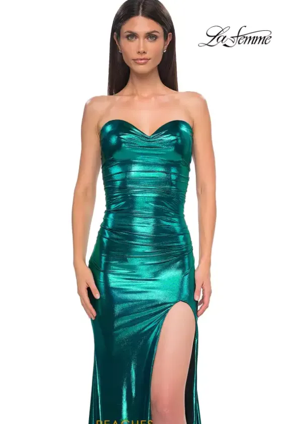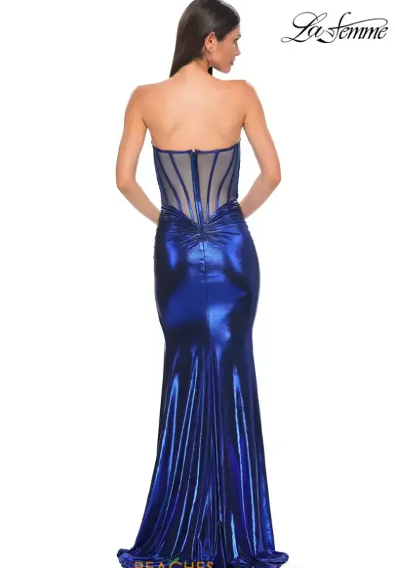 be the talk of the night when wearing this long fitted dress by La Femme, style 32806. Showcasing a strapless modern sweetheart neckline leading to a lovely back see through corset top ending with a zipper closure and ruching on the back of the ensemble. Featuring an exquisite silhouette that will hug your bodice phenomenally and that will have all eyes on you. This number is made out of shiny jersey lame material to give it a special effect. For the perfect final touch it has a sexy high thigh slit and a sweep train.