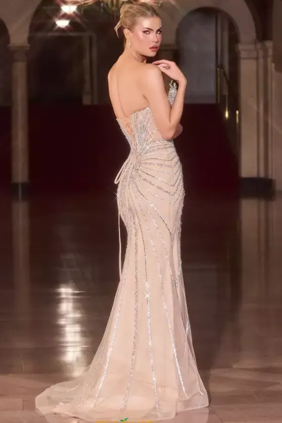 Make a statement in this one of a kind La Divine by Cinderella prom dress style 106CD715. This striking skin tight dress boasts 3D floral appliques that rise from the strapless plunged neckline and match the shimmer of the swirl detailed fitted skirt. The swirl beadwork unwinds into several glistening rows of beads.