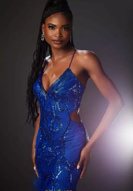 Step out of your comfort zone in this fun and flirty Moriless long dress 48039. Featuring a v neckline with simple straps that gracefully make their way along the back into a corset lace up. Fitted long dress is beautifully adorned with lovely applique long the fitted bodice and is complemented by chic feathers along the fitted skirt.