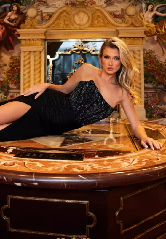 An effortlessly glamorous look can be achieved in 70305 by Rachel Allen. A fully beaded corset with a strapless, scoop neck line stands out among the boning, and is gorgeously contrasted with a figure hugging Jersey skirt. Rouche can be found on the back zipper and above the side slit for that classy, elegant look.