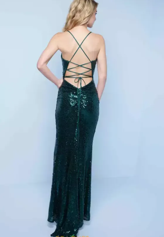 Turn heads at your next social occasion in this shimmering sequined style K723 by Splash. This glimmering gown is full adorned with sequins and 3D flowers. The bodice showcases a v neckline, spaghetti straps and a lace up tie low open back. The long slim fitting skirt has an edgy thigh high front side slit that shows off your legs beautifully.