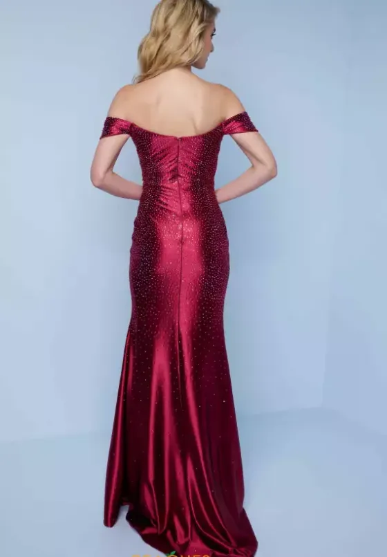 Look and feel best dressed when you show up in this timeless Splash long dress K737. This elegant fitted style showcases a sweetheart neckline with off the shoulder cap sleeves. The satin jersey material is covered with captivating heat pressed stones that give the perfect amount of sparkle. Be sure to flaunt your graceful sweep train.