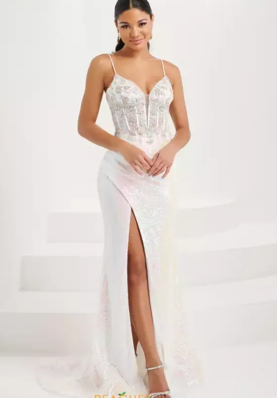 Strike a pose in this dynamic long fitted Tiffany dress 16100. Exude elegance in this sophisticated gown that showcases a plunging v neckline and thin dainty straps. Show off your figure, in this sensational fitted dress that features a flattering corset bodice encrusted in gleaming beads. Radiant sequins adorns the entire gown giving thisb gown the perfect pop of sparkle.