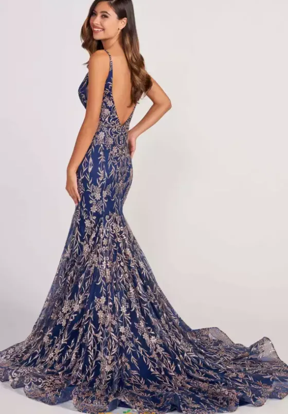 Look like modern day royalty in alluring long dress CL2021 by Colette. From top to bottom the fitted silhouette is adorned in symmetrical glitter patterns that give this dress the perfect amount of sparkle. The bodice flaunts a V neckline and is supported by thick straps that reach to the low open back. The train is eye catching with glitter patterns that shimmer vibrantly and a lovely horsehair hem.