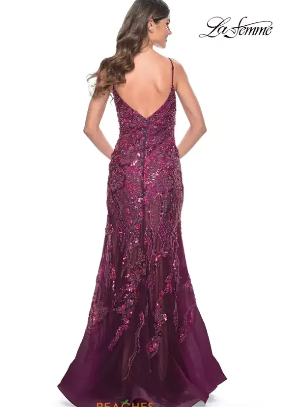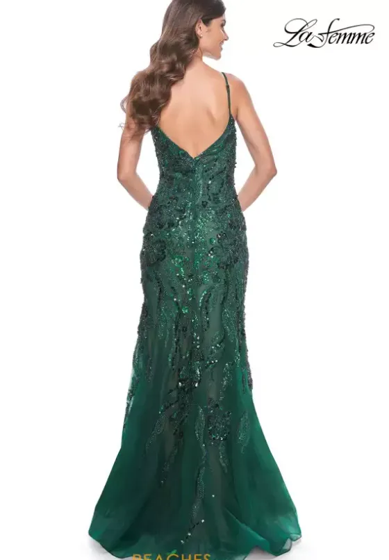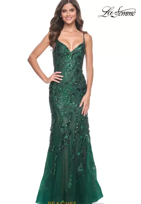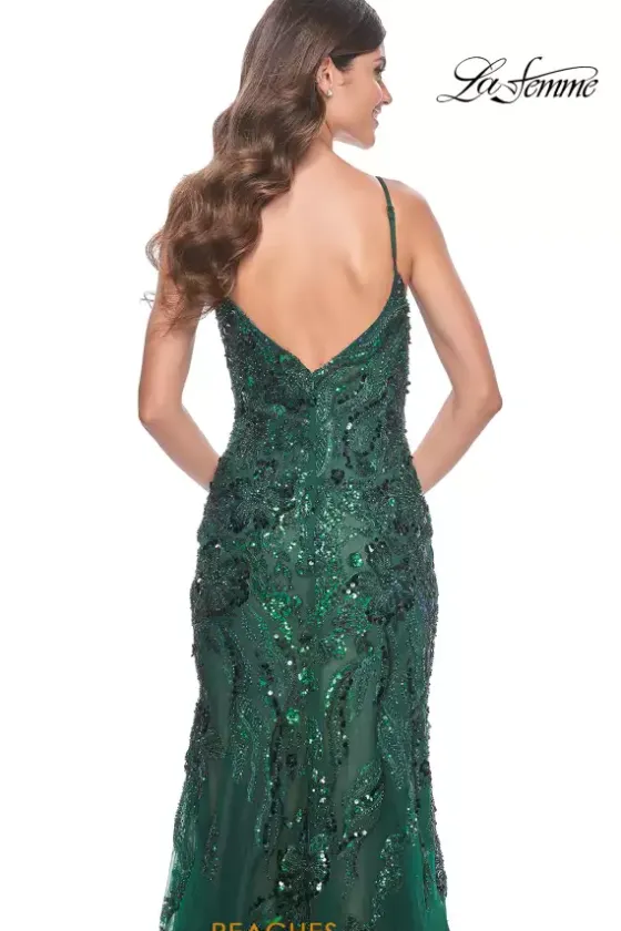 Dazzle the night away in this phenomenal fitted style dress by La Femme, style 32049. This outstanding dress comes in a dark burgundy, a gravitating green shade, and a ravishing navy. This V shaped neckline dress is completely covered in glistening sequins and paired with lace that makes perfect for picture taking and will absolutely have heads turning.