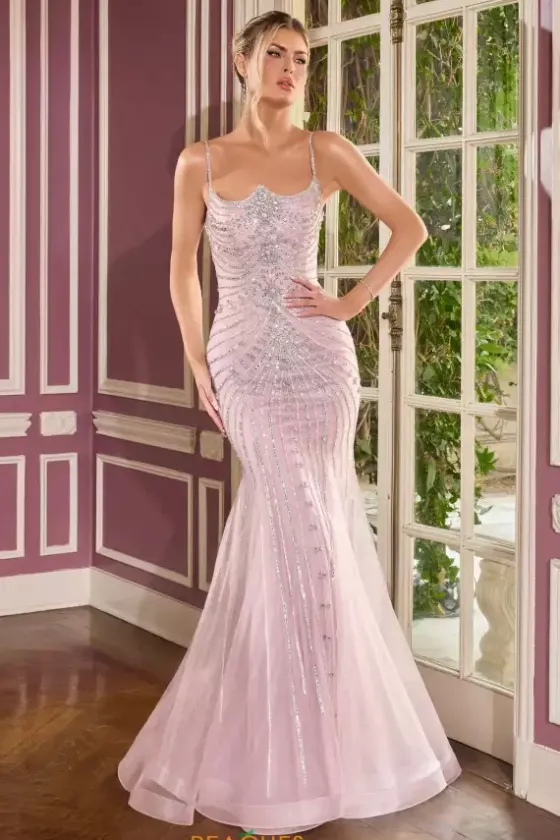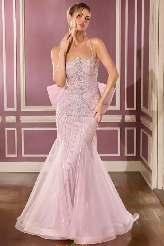 Be a beauty queen in this magnificent La Divine by Cinderella fit and flare prom dress style 106CB167. This flawless bedazzled mermaid dress flaunts symmetry and balance through radiant crystal floral patterns and draped beaded columns that have been sewn to perfection throughout the entire skin tight sweep length dress. The oversized bow embellishment and reversed sweetheart neckline make this dress stand out.