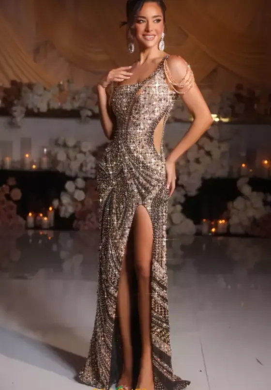 Have your red carpet moment in this bejeweled Portia and Scarlett dress style PS25985C. Dripping in rhinestones, beads, and sequins that are hand sewn this dress showcases an asymmetrical neckline with a thing shoulder strap. Hanging from the strap in strands of beading. A key hole cut out swirls in the front.