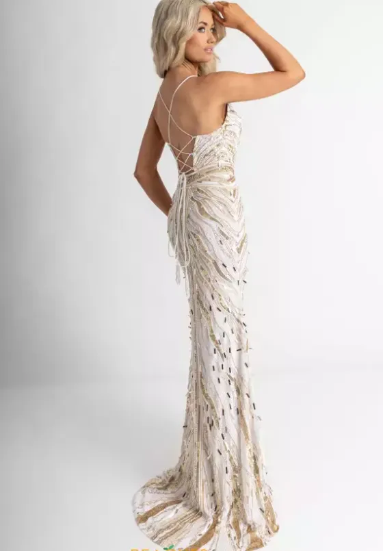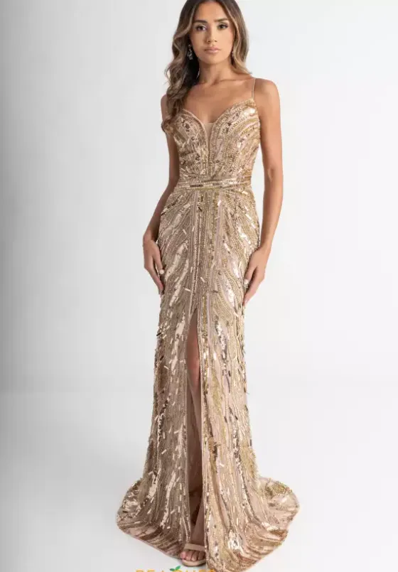 Radiate like sunshine in this stunning Rachel Allan long dress style 70990 drenched with sparkling lines of sequins and beads. This shimmering silhouette showcases a fitted bodice with spaghetti straps and low open lace up tie back. The long slim fitting skirt has a sexy high front slit and back sweep train.