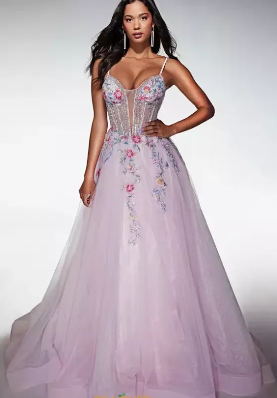 Look like elegance in this shimmering on trend Alyce Paris beaded prom dress style 62068. This dress is trendy from top to bottom with a bedazzled sheer corset bodice that glimmers endlessly paired with the beaded flower embellished tulle skirt. This dress is completed with an adjustable lace back and dramatic sweep train.
