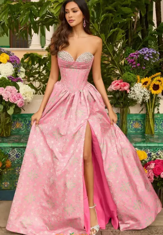 Unique style 42318 by Ava Presley will have people taking a second glance. Featuring the flattering fitted corset bodice detailed with exquisite beadwork which delicately decorates the trim of the bust. Showcasing the pleating trimming the flare of the full novelty skirt displaying the tasteful slit and dramatic fly away train.
