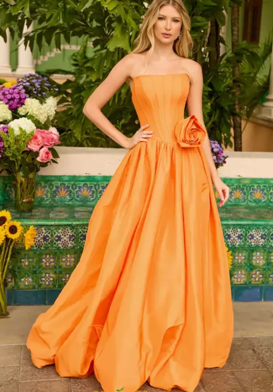 Be the belle of the ball in this amazing Ava Presley a line dress style 47204. The all over taffeta dress has a long waisted corset bodice with a strapless straight across neckline. The flowy skirt is on trend with a bubble style hem. A three dimensional flower sits on the hip of the waist line right above the slit.