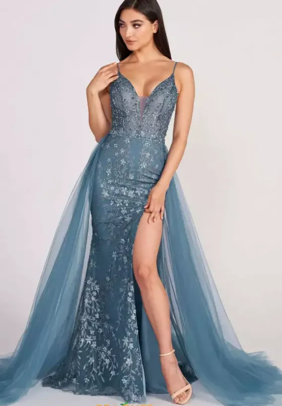 Have a show stopping entrance and a jaw dropping exit with this gorgeous Ellie Wilde long dress EW34058. Featuring a plunging neckline with simple straps that gracefully make their way along the open back. Made out of jersey material, this stunning fitted dress is beautifully decorated with eye catching cracked ice. The thigh high slit is perfectly accompanied by a detachable overskirt.