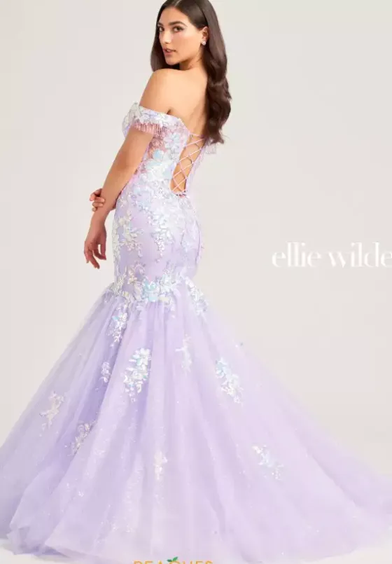 Feel your best in this captivating dress by Ellie Wilde, style EW35219. This dress has a fascinating lace back and long, luscious train that will immediately make you the center of attention as you step into prom. The off the shoulder look that this dress provides gives off a very elegant and fairy tale look as well.