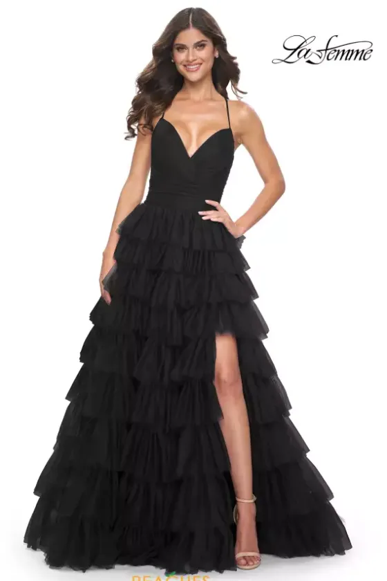Feel and look stunning in this magnificent ball gown style dress by La Femme, style 32086. This dress comes in a gorgeous black shade, a dark burgundy, and a luxurious green. This V shaped neckline dress is made with amazing tulle and absolutely no beaded detail, which adds on to the elegancy and simplicity that this dress showcases.