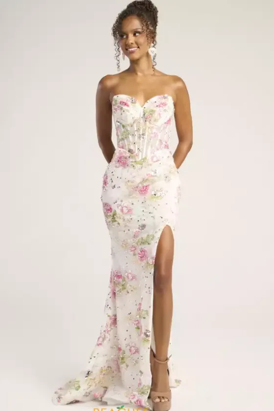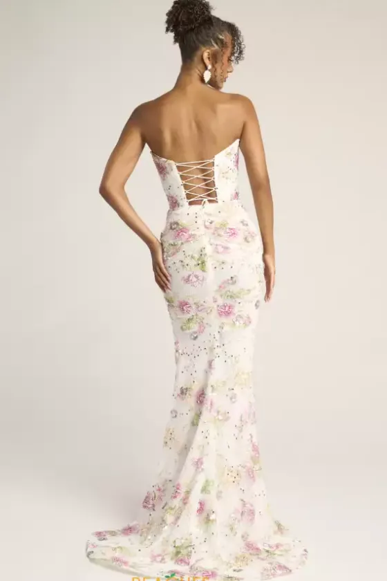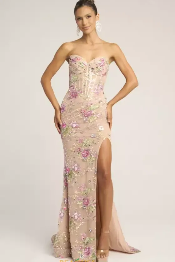 Exude timeless elegance in this stunning long fitted dress designed by Portia and Scarlett style, PS26021. Featuring a strapless sweetheart neckline and an outstanding corset with a flattering lace up back. This entire dress is detailed with a mix of dazzling beadwork, sequins and applique. A thigh high slit and a lovely long train is the perfect final touch.