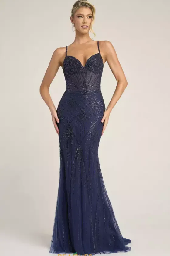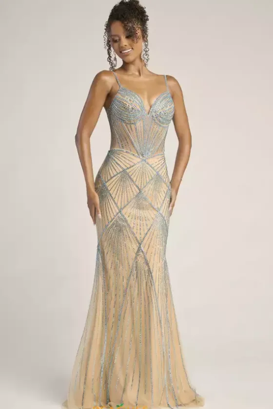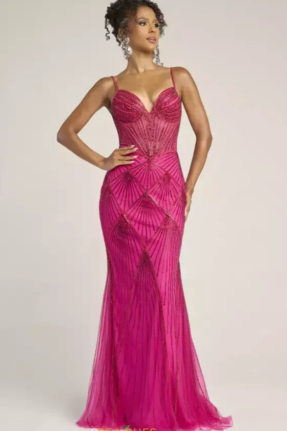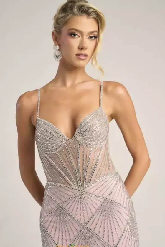 You will not go unnoticed when this bedazzled Portia and Scarlett Prom dress style PS26263 shines from every angle. This zipper closure corset dress is supported by dainty spaghetti straps that match the beadwork of the deep v neckline and mimicking beadwork of the bodice. Diamond shaped patterns shimmer throughout the sweep train skirt.
