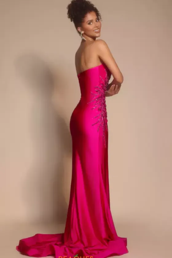Channel your inner fashionista when you show up to your special event in this chic Portia and Scarlett long dress style PS26331E. The strapless sweetheart neckline dress is made from a stretchy jersey material. The beautiful rhinestone beading adorns the dress starting at the bust and continue down the long side of your hips.
