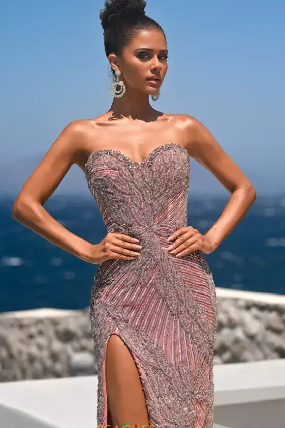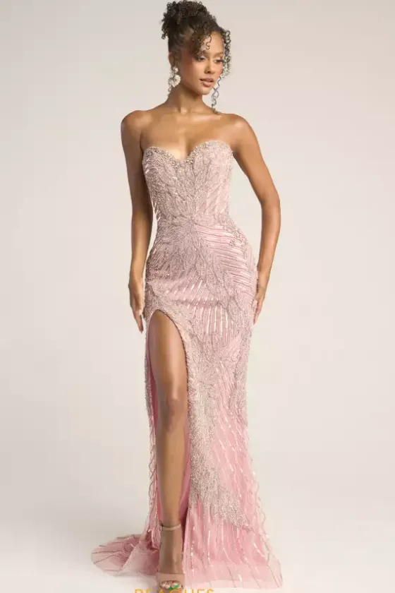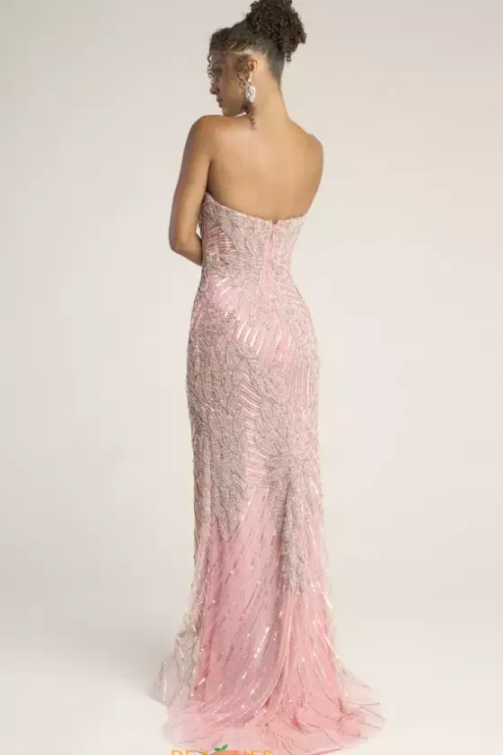 Look positively perfect at prom in this pretty pink Portia and Scarlett long dress style PS26435C adorned in an intricate pattern of sequins, beads and crystals. This shimmering gown showcases a strapless, fitted bodice with a sweetheart neckline and low center zipper back. The long slim skirt has a side slit and back sweep train.