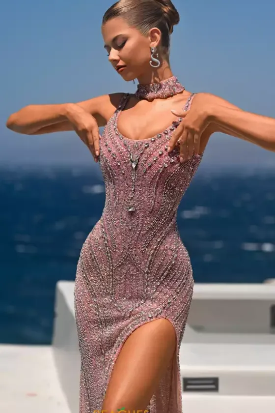 Be bold and rock this all over beaded Portia and Scarlett long dress style PS26438C to your next special occasion. The fully beaded dress is only available in this pink and silver combination. The scoop neckline showcases thick shoulder straps. The fitted dress is bejeweled in the perfect combination of gems and jewels.