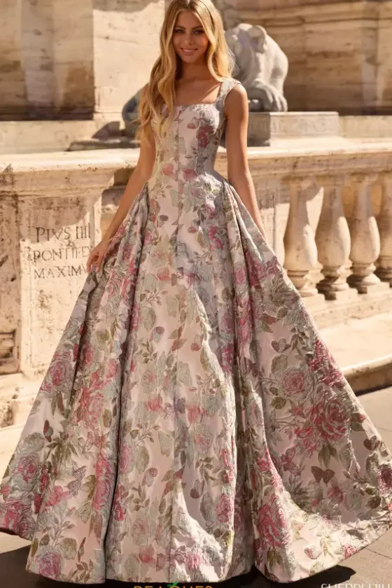 Look like royalty at prom in this majestic Sherri Hill ball gown style 57812 made in rich brocade print fabric. This regal silhouette features a fitted bodice with cap sleeves, squared off neckline and low scoop back. The long, a line skirt has side pleats for fullness with a floor sweeping dramatic hemline.