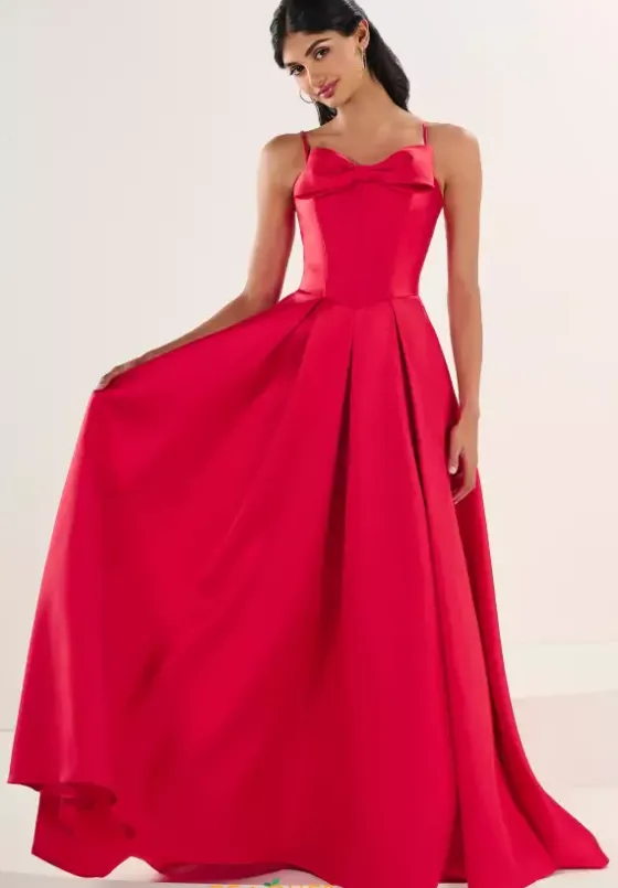 Feel elegant and regal when you show up to any event wearing this flattering long A line dress by Tiffany style 16265. Featuring a classic sweetheart neckline that shows off the beautiful big bow right in the center. The corset will hug your figure perfectly followed by a back zipper. The skirt is made out of marvelous mikado material.
