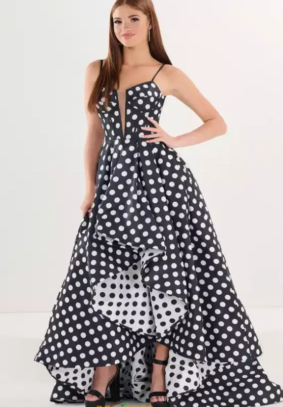 Enter the room with confidence in this stunning Tiffany dress, style 16324. It features dainty straps paired with a beautiful deep V neckline. The structured corset bodice creates a flattering, sculpted silhouette. The skirt adds a playful touch with its unique ruffling, making it truly eye catching. A low back finishes the look, perfect for a sexy, unforgettable exit.