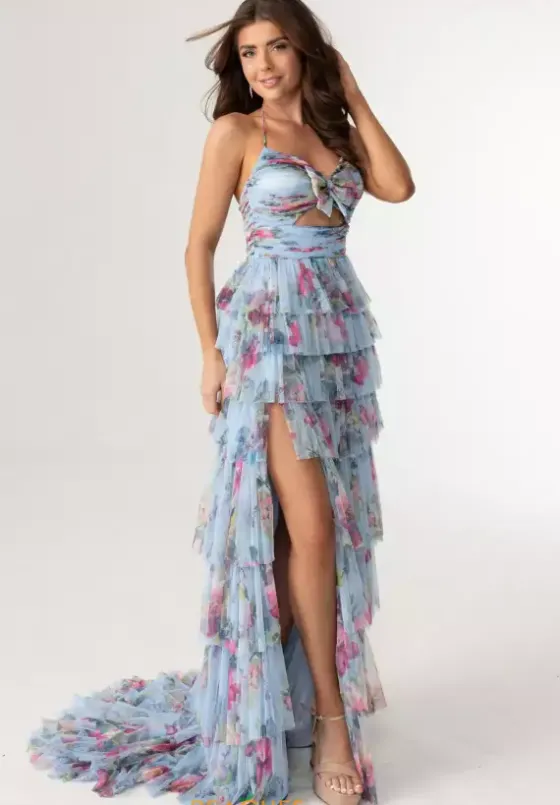 Channel your inner girlie girl and wear this enchanting Rachel Allan long dress style 71010 to prom. Made in a gorgeous stretch tulle light blue floral print, this whimsical style features a fitted ruched bodice with front cut out, bow and spaghetti halter tie neck. The long straight skirt has ruffle, tier layers with a high low slit and back sweep train.