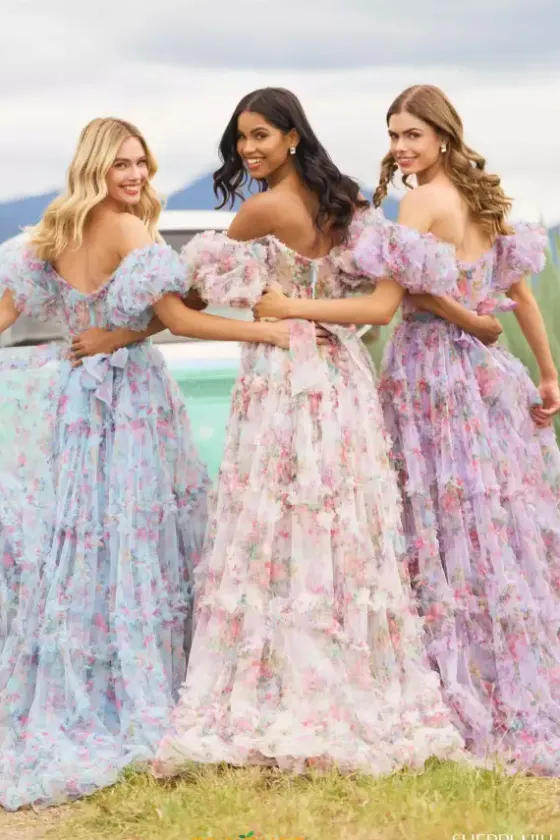 Get that princess feel with this enchanting Sherri Hill gown 55541. mesmerizing a line dress displays a sweetheart neckline with lovely puffed cap sleeves. Sheer corset bodice is accompanied by a layered tulle skirt. Made out of tulle material, this stunning ball gown is fully decorated by flowered detail that definitely give you a princess feel.