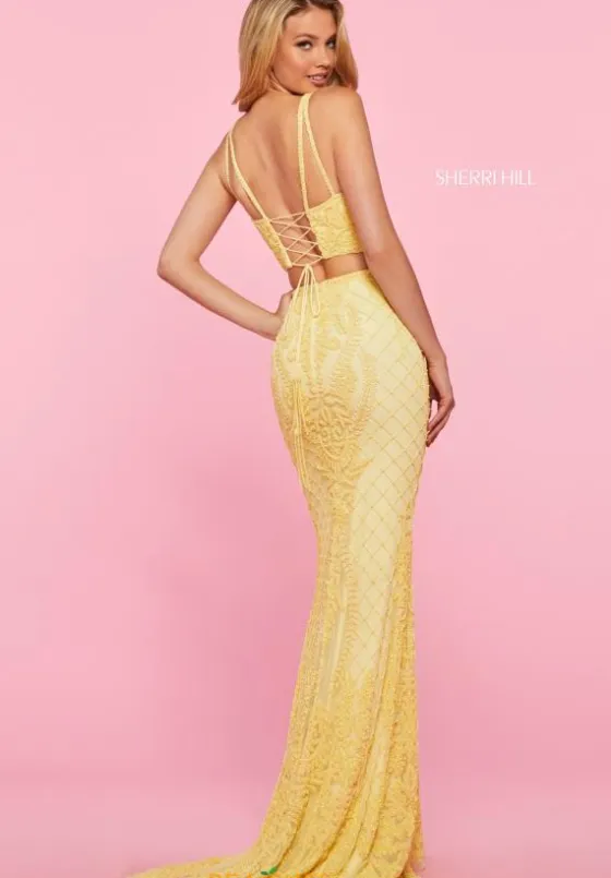 Captivate the room when making your entrance wearing this bright and bold Sherri Hill two piece gown 53437. Featuring a V-cut neckline along the crop top, elegant bead work whimsically trails throughout for a breathtaking patterning that is sure to turn heads. A double strap detailing offers support on your special night as a lace up closure along the back allows comfort. The fitted skirt highlights your curves opulently as the bead work cascades down, finishing along the train.