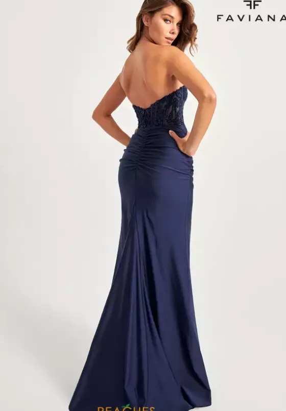 Combine chic with sophisticated and wear this alluring Faviana beaded charmeuse prom dress 11081. The zip up corset bodice has a strapless neckline and is adorned in shimmering beadwork to complement the sleekness of the long skirt. Ruching is featured on the top of the skirt and on the zip up closure.