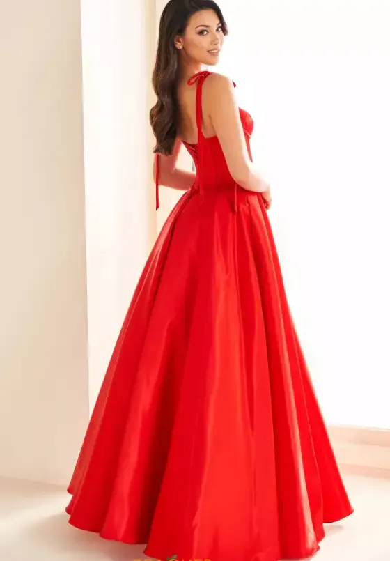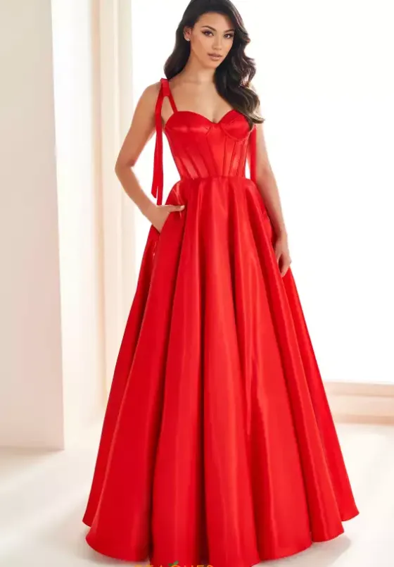 Simple sophistication exudes when you wear this glamorous Ellie Wilde long dress style EW32610 to your prom. Made is gorgeous shades of satin fabric, this impeccable style features a structured corset bodice with a sweetheart neckline, shoulder tie thick straps and lace up tie back. The full, ball gown, long skirt has side pockets and a hemline that flows to the floor.