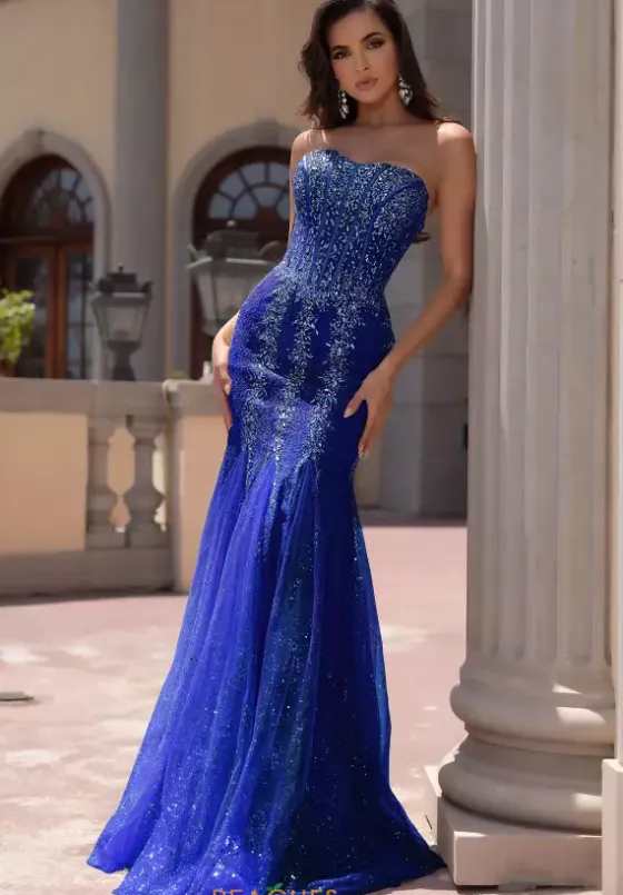 Feel like you just step foot of the red carpet when wearing this magnificent long dress by Portia and Scarlett, style PS25169. Showcasing a fitted mermaid silhouette with a strapless sweetheart neckline. The corset bodice is fully adorned with glistening beadwork that cascades down the dress.