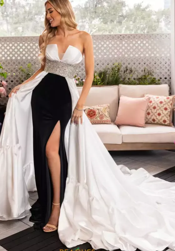 Need an elegant, bold dress? Rachel Allan Pageant dress 50381 is the one for you! The long fitted velvet skirt with a slit, paired with a beautiful satin overskirt that flows behind you, is a perfect mix of sexy and chic. You’ll steal the spotlight as you shine under the light with the beaded waistband/bodice that snatches your waist and highlights your curves. You can accessorize this dress with your favorite necklace that will pair well the strapless v neckline.
