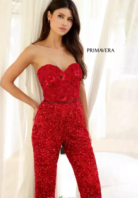 This stunning strapless beaded jump suit by Primavera 4383 is a breathtaking combination of sophistication and glam. This gorgeous jump suit is adorned with an intricate beadwork that will have you shimmering from every angle. The back is given an open lace up back for the most flattering and secure fit.