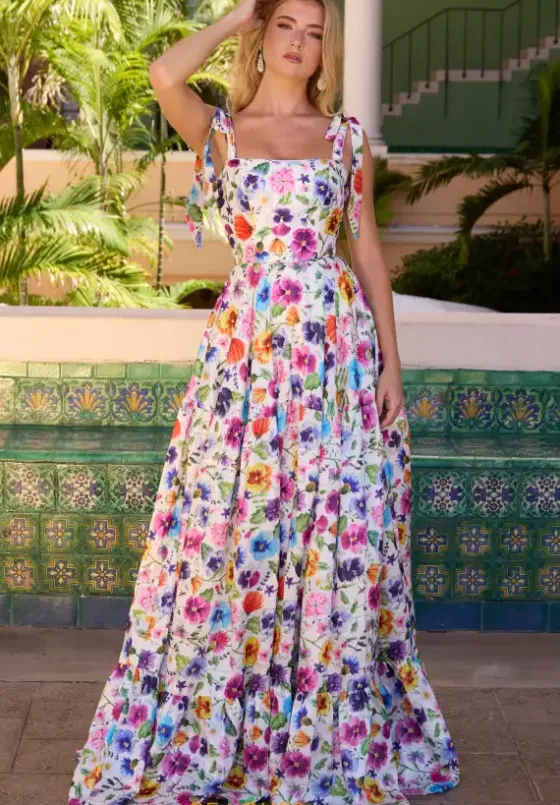 You will catch all eyes on you wearing unique long style 42266 by Ava Presley. Featuring the fitted bodice complimented a scoop neckline and paired with straps which delicately tie into a bow along the shoulders. Made from a satin material and cut from a unique floral pattern that will have all mesmerizing over you all day and night.