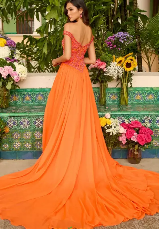 Show off your sophisticated side with this stunning a line dress from Ava Presley. Style 47254 comes in bold bright colors. With a v neckline and off the shoulder cap sleeves, the drop waisted bodice is bejeweled with all hand sewn bead work. The chiffon flowing a line skirt has a thigh high slit and sweeping train.