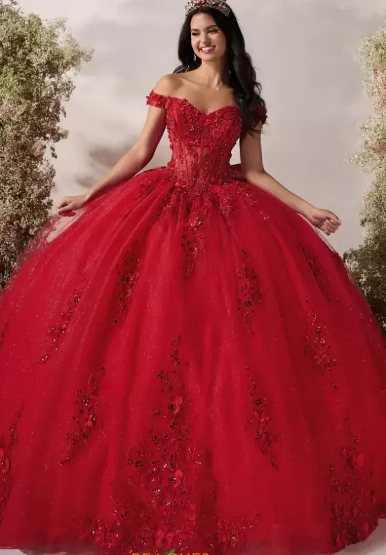 Drop jaws when you enter the room in this mesmerizing ball gown by LizLou Quinceanera, style 56548. Showcasing a sheer corset and a classic sweetheart neckline with off the shoulder cap sleeves. This ensemble is embellished in flawless applique and beadwork. While the skirt is made from sparkle tulle, making you shine even more. The train and bow complete this lovely look.