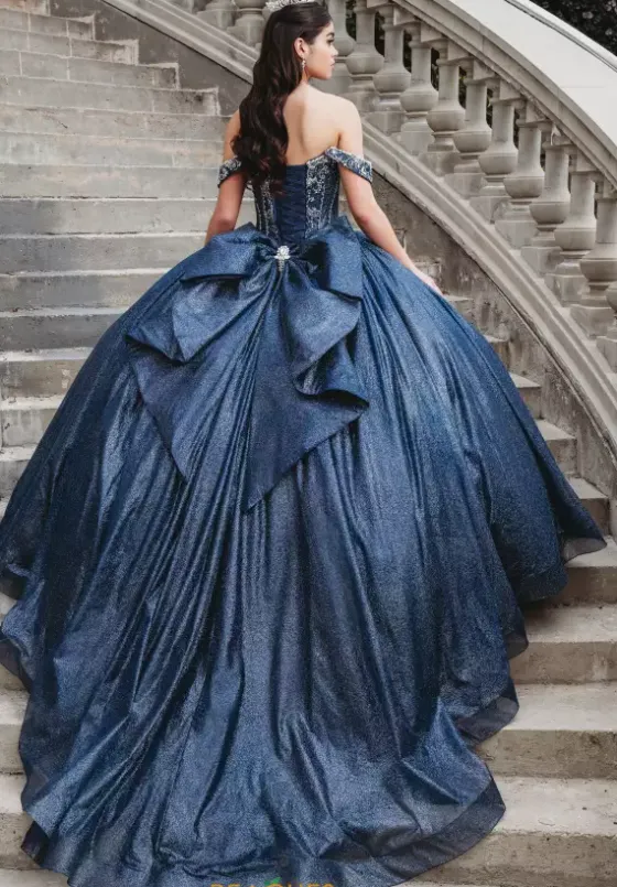 Jaw dropping Amabelle quinceañera dress style Q1013 features a regal fitted bodice embellished in ornate beadwork, adding lavish and sparkling detail. The sweetheart neckline displays beaded cap sleeves that look princess-like. The glittering voluminous skirt is complete with a train and is topped off with a dramatic bow. Detachable bow included.