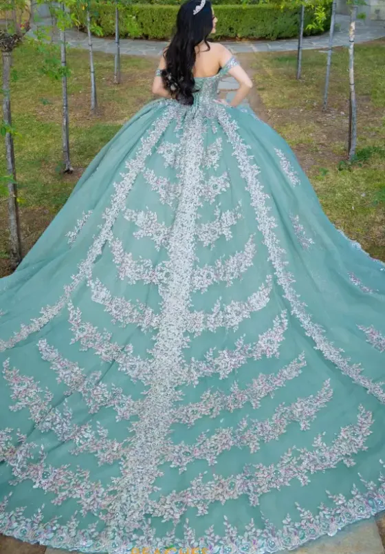 Live your fary-tale princess dream in this enchanting long dress by LizLuo Quinceanera. Showcasing strapless sweetheart neckline with detachable cap sleeves. This numbers bodice is adorned with lace applique and dazzling beadwork that cascade down the whole dress all the way down to the fabulous long train.