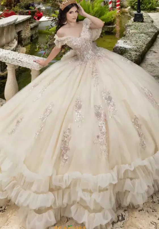 Make a grand entrance wearing this fabulous Quinceanera dress 26108 by LizLou for your special occasion. This mesmerizing ballgown showcases a sweetheart neckline with off the shoulder straps paired with a fitted corset bodice. Gorgeous floral applique cover the full skirt leading to a show stopping sweep train.