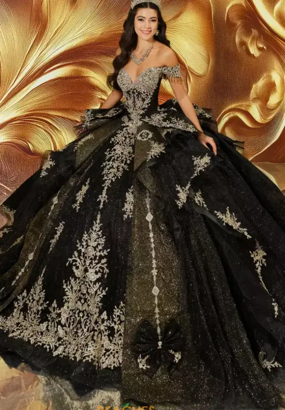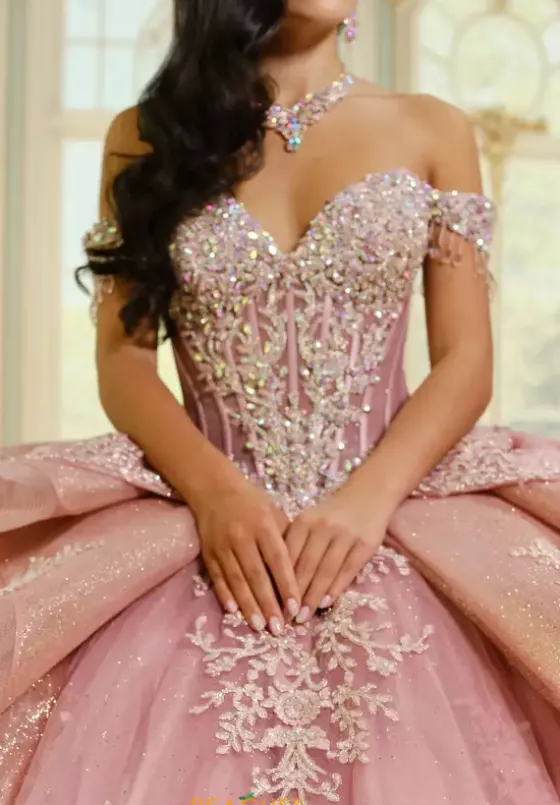 Feel elegant and regal in this breathtaking Princesa Quinceanera gown, style PR30203. Designed with versatility in mind, this gown features detachable, beaded fringe straps that add a glamorous touch. The bodice includes a built in corset fully adorned with intricate beadwork and comes with a matching capelet, offering modesty while maintaining a true princess look. The lace up back includes a modesty panel for extra comfort and security. The full skirt stuns with a detachable bow and an equally dramatic detachable overskirt—guaranteed to wow the crowd. Hidden, seamless pockets add functionality without compromising elegance. To complete this impeccable look, the gown includes an embroidered, beaded initial patch, making it truly unforgettable.