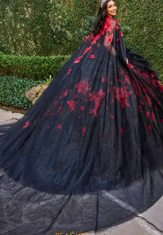 Stop the show upon your entrance in the extravagant quinceanera dress style RQ1144 Rachel Allan Quince. Featuring the illusion bodice that is loving adorned with meticulous beadwork and is enclosed with a full corset lace back. The full tulle skirt is complimented with ruffles and intricate floral appliques. Long cape sold separately as QS1144.