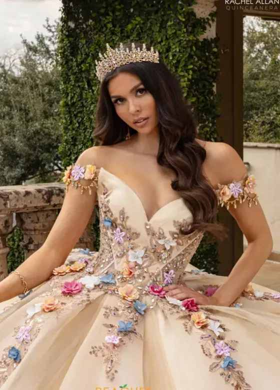 Be the talk of the night wearing Rachel Allan Quince style RQ6000. This one of a kind ball gown showcases a lovely v neckline with off the shoulder cap sleeves. The gorgeous fitted bodice and full glitter tulle skirt is adorn with unique multi color floral applique and eye catching sweep train that will have all eyes on you.