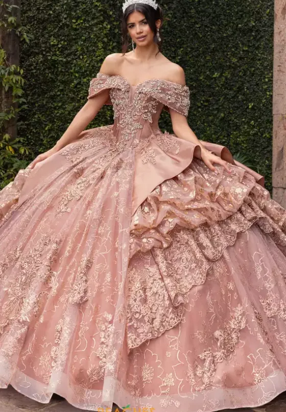 Walk into your special event and wow the crowd wearing Rachel Allan Quince style RQ6001. This magnificent ball gown showcases a fabulous sweetheart neckline paired with off the shoulder cap sleeves. The fitted bodice and full glitter tulle skirt is decorated with unique lace applique and dazzling beadwork adding all the drama.