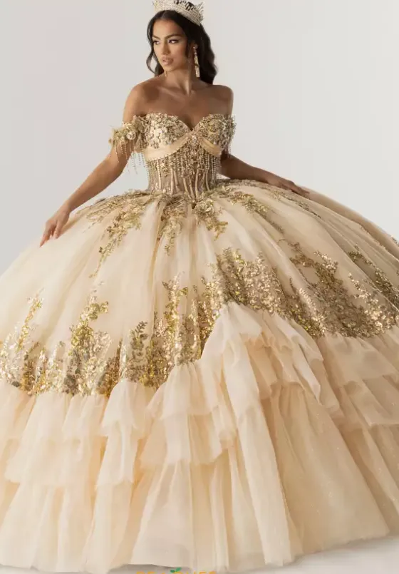 Gleam effortlessly in show stopping ball gown style RQ6012 by Rachel Allan Quince. The off the shoulder cap sleeves are delicately decorated to match the detailing along the trim of the neckline which cascades in a line of beaded fringe to dangle beautifully. Showcasing the full glittered tulle skirt displaying the ruffled tiered bottom with trailing glittered sequin to highlight the gown gracefully all night.